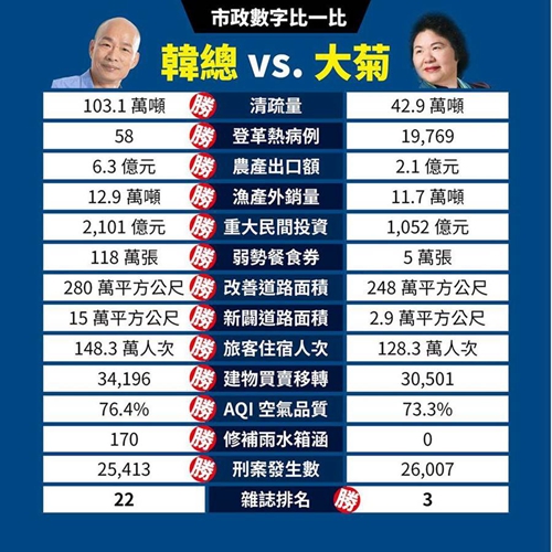 高雄副市長貼對照圖韓國瑜一年政績遠超陳菊 網友大贊