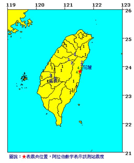 16日4時(shí)13分發(fā)生3.7級地震,地震深度8.4公里,震中位于花蓮縣政府南偏西方19.5公里(位于花蓮縣壽豐鄉(xiāng)),最大震度花蓮縣4級。