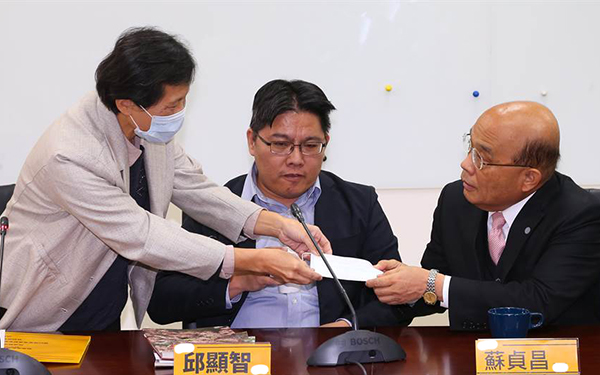 “時代力量”“立委”陳椒華在拜會過程中送口罩給蘇貞昌,希望蘇在密閉空間戴上。(圖片來源:臺灣“中時電子報”)