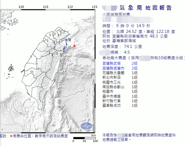 今天(25日)上午9時(shí),臺(tái)灣東部海域發(fā)生一起里氏4.5級(jí)地震。(圖片取自臺(tái)媒)