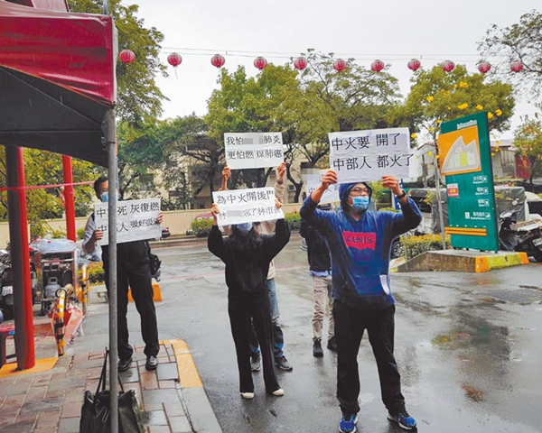 臺當局“交通部長”林佳龍14日至臺中市東區視察,場外示威人士高舉“中火要開火了,中部(臺灣中部)人要火了!”標語抗議。(圖片來源:臺灣“中時電子報”)