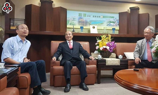 高雄市農(nóng)會(huì)理事長(zhǎng)蕭漢俊(右)表示,臺(tái)灣前“立法院長(zhǎng)”王金平(中)認(rèn)為民進(jìn)黨傾全力“罷韓”,身為國(guó)民黨員,王會(huì)在適當(dāng)時(shí)講適當(dāng)?shù)脑挘響B(tài)支持韓國(guó)瑜(左)。(圖片來(lái)源:臺(tái)灣“中時(shí)電子報(bào)”)