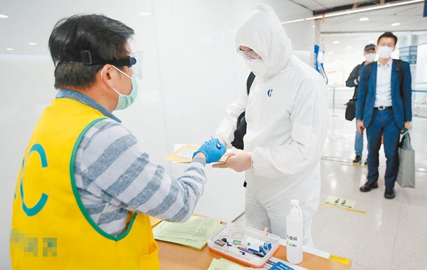 圖為一名穿著防護衣的旅客抵達(dá)桃園機場。(圖片來源:臺灣“中時電子報”)