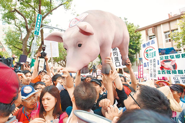 圖為臺(tái)灣民眾此前在臺(tái)“立院”外抗議瘦肉精美豬進(jìn)口。(圖片來源:臺(tái)灣“中時(shí)電子報(bào)”)