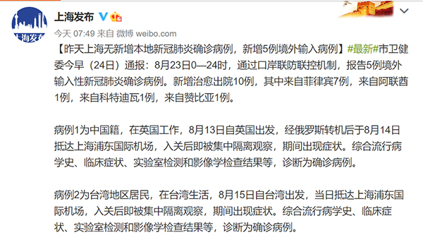 中國臺灣網8月24日訊 繼8月18日后,上海市24日再度通報新增臺灣地區輸入確診病例。據上海市政府新聞辦公室官方微博帳號“上海發布”消息,上海市衛健委24日早上通報:8月23日0—24時,通過口岸聯防聯控機制,報告5例境外輸入性新冠肺炎確診病例,其中1例為臺灣地區輸入病例。