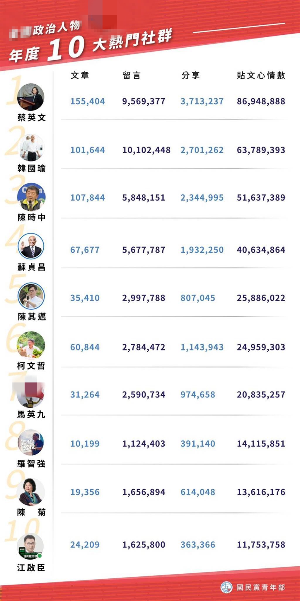 國民黨青年部主任陳冠安說,臉譜網(wǎng)是臺灣最主要的政治攻防網(wǎng)絡戰(zhàn)場,他以文章、留言、分享、貼文心情數(shù)做大數(shù)據(jù)分析,全臺12強依次是蔡英文、韓國瑜、陳時中、蘇貞昌、陳其邁、柯文哲、馬英九、羅智強、陳菊、江啟臣、侯友宜及賴清德。