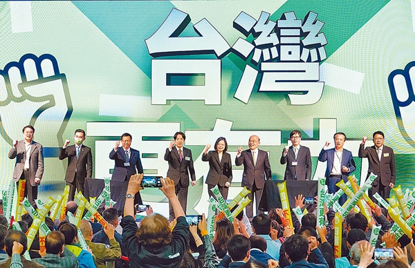 民進黨14日舉行黨員代表大會,蔡英文(中)率眾呼吁四項“公投”“四個不同意”立場。(圖片來源:臺灣“中時新聞網”)