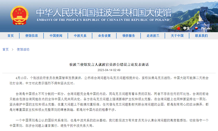 波蘭政府個別官員妄稱如烏克蘭戰敗,大陸次日就會“攻臺” 我使館駁斥