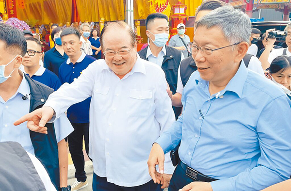 民眾黨主席柯文哲(右)12日到三重先嗇宮參拜,董事長李乾龍(左)親自接待。(圖片來源:臺灣“中時新聞網”)