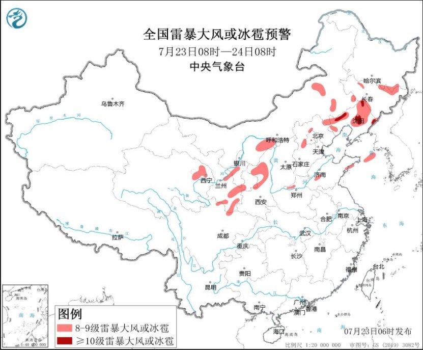 中央氣象臺7月23日06時繼續發布暴雨藍色預警和強對流天氣黃色預警。預計,7月23日08時至24日08時,甘肅東部、寧夏南部、陜西中部、川西高原北部、四川盆地西北部、吉林南部、遼寧中北部、廣西南部等地部分地區有大到暴雨,其中,甘肅東部和陜西中部偏西地區等地局地有大暴雨(100~140毫米)。上述部分地區伴有短時強降水(最大小時降雨量30~50毫米,局地可超過80毫米)(見圖1),內蒙古中東部、黑龍江東南部、吉林西部和北部、遼寧中北部和西部、青海東部、甘肅東部和南部、寧夏西部、陜西中北部、北京西北部和西南部、河南北部、四川北部等地的部分地區將有8級以上雷暴大風或冰雹天氣,其中,遼寧中北部和西部等地局地將有10級以上雷暴大風,最大風力可達12級以上。