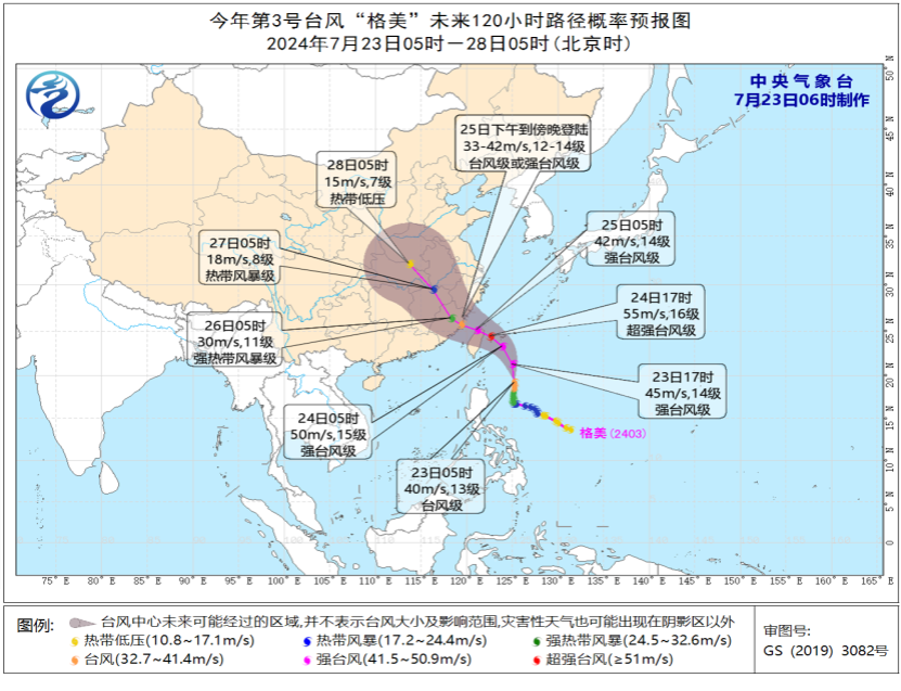 今年第3號臺風“格美”未來120小時路徑概率預報圖(7月23日05時-28日05時)