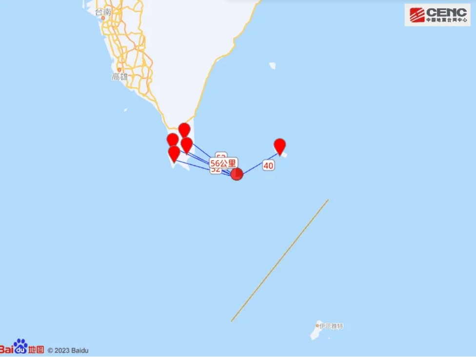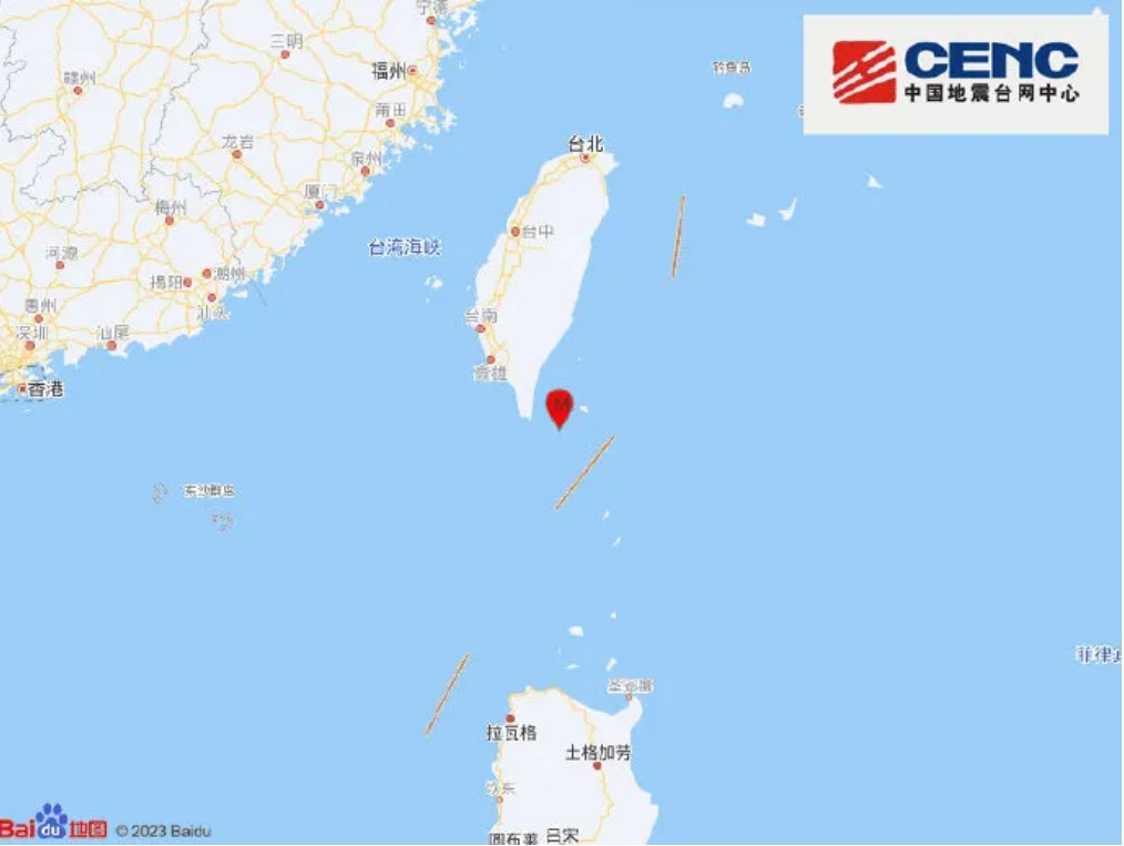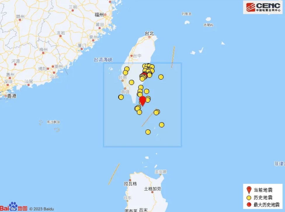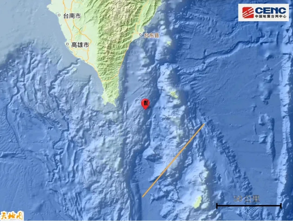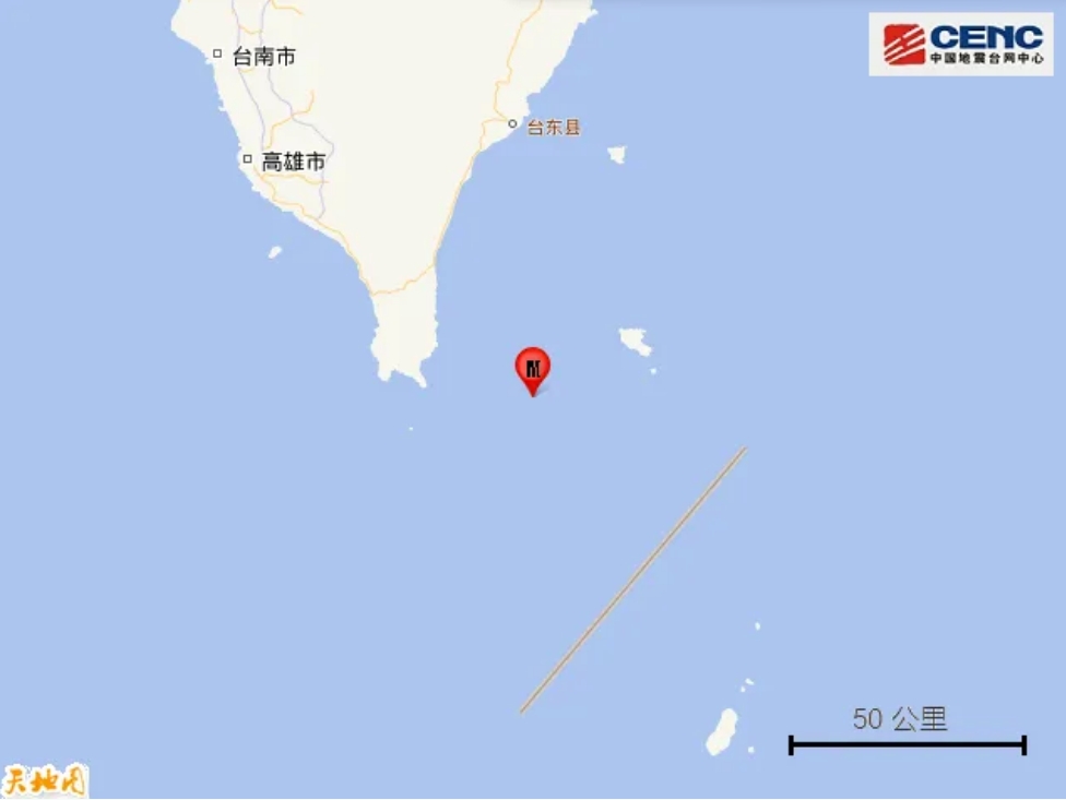 速報參數:據中國地震臺網正式測定,7月27日19時21分在臺灣屏東縣海域發生4.5級地震,震源深度28公里,震中位于北緯21.86度,東經121.22度,距臺灣島約36公里。