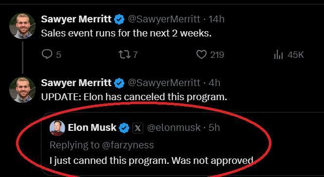 沒想到這則帖文被特斯拉創始人兼首席執行官埃隆·馬斯克刷到,但他卻在下方留言說,此活動未經允許,已取消。(編輯/劉佳辰)