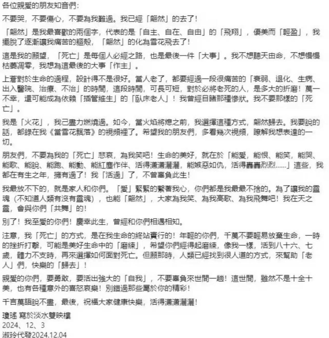 瓊瑤代表作有《窗外》《還珠格格》《煙雨濛濛》。她的社交媒體更新了一則“遺書”,“我不想聽天由命,不想慢慢枯萎凋零,我想為這最后的大事‘作主’!