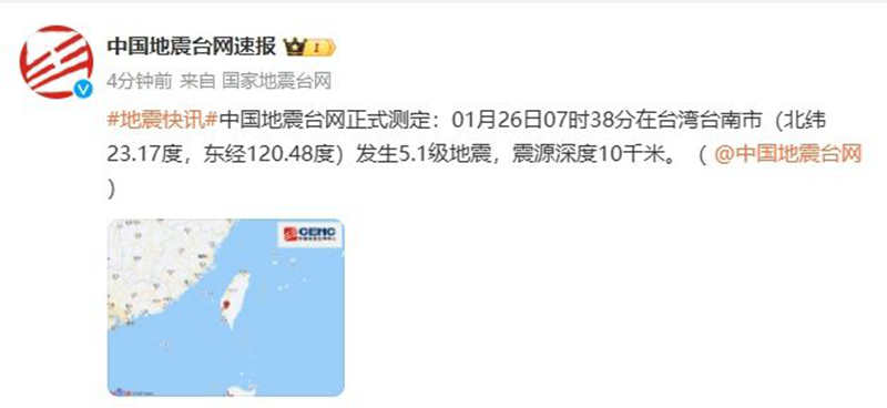 中國臺灣網1月26日訊 中國地震臺網正式測定:1月26日7時38分,在臺灣臺南市(北緯23.17度,東經120.48度)發生5.1級地震,震源深度10公里。(編輯/楊永青)