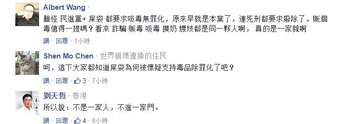 還有網友驚覺道“難怪屎袋(注:島內網友對“時代力量”的“愛稱”)會支持民進黨的‘毒品除罪化’主張”、“不是一家人不進一家門啊”。