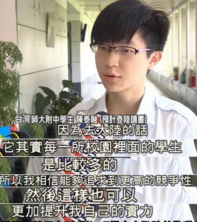 “除了一流大學(xué)外,不少學(xué)生還一口氣申請了5、6所大陸大學(xué)”,桃園市復(fù)旦高中校長段臺民說,就算是大陸2、3線的大學(xué),學(xué)生也都會申請,根本就是“吃了秤鉈鐵了心”的要到大陸念書;武陵校長林清波也以校內(nèi)一名程度“優(yōu)秀”的學(xué)生為例,指就算已獲保送臺大資格,但這名學(xué)生仍決定考學(xué)測以申請北京大學(xué)元培學(xué)院,而該學(xué)生的哥哥去年就已到北京清華大學(xué)念書了。