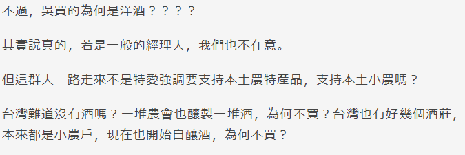 再來說送禮的內容,洋酒。以往蔡英文曾被爆料愛吃法國大餐,這回吳音寧送禮送洋酒算是對上了。只不過你吳音寧口口聲聲說要支持本土農產品,霸占道德高地,到頭來卻做起了洋酒“生意”,不覺得臉疼嗎?下面這位臺灣網友說出了大部分人心里的感受: