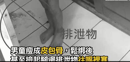 警方指出,此次遭虐的是二人年僅3歲的么兒,該男童有輕微行為障礙、學習遲緩。當天生母前往家中探視,沒想到卻見兒子全裸在陽臺罰站,雙手還綁著束帶、繩子,且全身不但有大小瘀青,還瘦成皮包骨,兩邊的肋骨清晰可見,一被放下后竟急著撿地上排泄物吃,媽媽當場失聲痛哭。