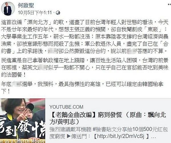 臺灣1111人力銀行副總經(jīng)理何啟圣發(fā)文表示,《窮到發(fā)慌》這首歌“道盡了目前臺灣年輕人對世態(tài)的看法”,直言“今天不是(臺灣)20年來最好的年代”,痛批民進(jìn)黨是自己拿著執(zhí)政權(quán)在地上踐踏,讓百姓生活陷入困頓,“臺灣的前景在哪里,蔡英文當(dāng)局似乎一點(diǎn)都不關(guān)心,只在乎自己在官邸能否吃到美味的法國餐”!