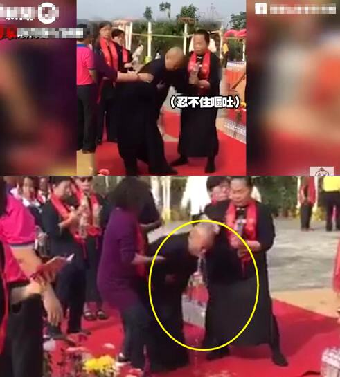只見法師先是嘗試露出微笑,但撐了不到2秒便伸手要身旁的信徒攙扶,大概是胃里的食物已經呼之欲出了,接著她就對紅毯大吐特吐了起來,信徒們看了也不知如何是好啊,只能拍拍法師的背,等她吐完。
