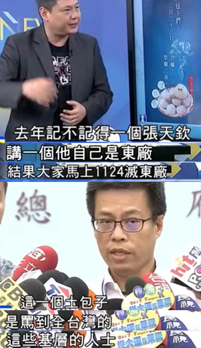 媒體人謝寒冰在節目中表示,去年“九合一”選舉,民進黨當局出了個“東廠廠公”張天欽,今天出了個黃重諺,一句話幾乎罵遍了臺灣所有基層人士。張天欽也算有了接班人。