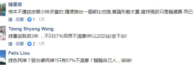 而親綠智庫“臺灣民意基金會”的最新民調(diào)則顯示,有57%的民眾不滿意蔡當局執(zhí)政表現(xiàn),比滿意的多19個百分點!基金會董事長游盈隆對此表示,考慮今年是“大選”年,作為執(zhí)政黨,這樣的民意反應當然不是一個好預兆。
