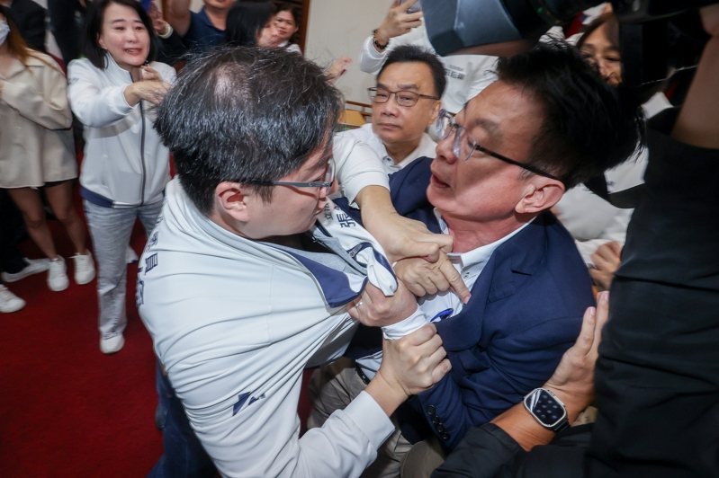 國民黨民意代表張智倫(左)和民進(jìn)黨民意代表郭國文爆發(fā)肢體沖突。 圖自臺灣《聯(lián)合報》