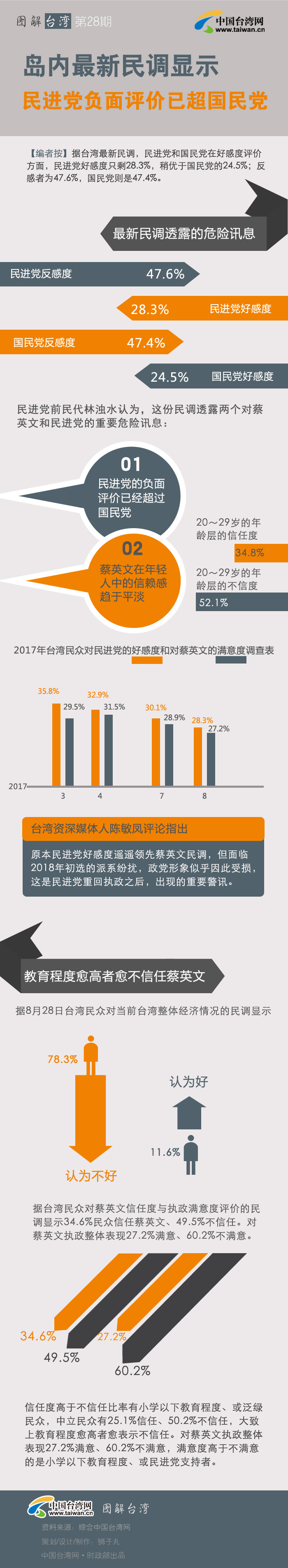 【編者按】據臺灣最新民調,民進黨和國民黨在好感度評價方面,民進黨好感度只剩28.3%,稍優于國民黨的24.5%;反感者為47.6%,國民黨則是47.4%。