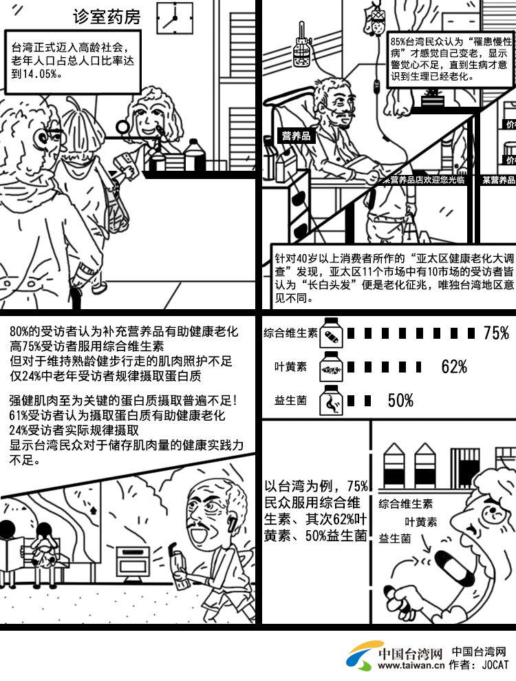 據(jù)臺灣“中時電子報”報道,臺當局“內(nèi)政部”宣布臺灣正式邁入高齡社會,老年人口占總?cè)丝诒嚷蔬_到14.05%。有醫(yī)療業(yè)者針對40歲以上消費者所作的“2018亞太區(qū)健康老化大調(diào)查”發(fā)現(xiàn),亞太區(qū)11個市場中臺灣人認為慢性病上身才算生理老化,雖然近8成受訪者認為補充營養(yǎng)品有助健康老化、高達75%受訪者服用綜合維生素,但對于維持熟齡健步行走的肌肉照護不足,僅24%中老年受訪者規(guī)律攝取蛋白質(zhì)。
