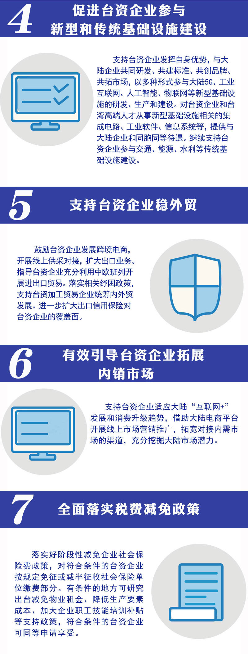 15日,國(guó)家發(fā)展改革委、國(guó)務(wù)院臺(tái)辦、工業(yè)和信息化部等十部門(mén)聯(lián)合印發(fā)了助力臺(tái)企“11條措施”。相關(guān)措施將進(jìn)一步幫助廣大臺(tái)商臺(tái)企應(yīng)對(duì)疫情和復(fù)工復(fù)產(chǎn),為臺(tái)商臺(tái)企提供更多發(fā)展機(jī)遇、同等待遇,對(duì)臺(tái)商臺(tái)企在大陸投資興業(yè)給予更有力支持。