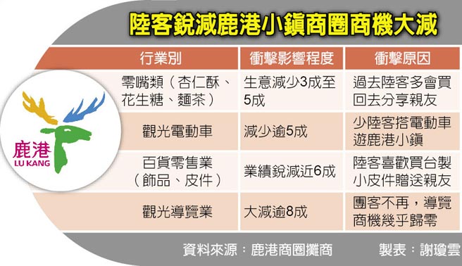 從鹿港大客車停車場(chǎng)通往天后宮的民生路,是所有大陸游客團(tuán)必經(jīng)之路。加上中山路周邊商圈,過去團(tuán)進(jìn)團(tuán)出或自由行的大陸游客人潮如今已經(jīng)不在了,取而代之的是東南亞、新加坡或日本的自助背包客,路邊的攤商數(shù)明顯減少、周末假日人潮也不如以往擁擠。