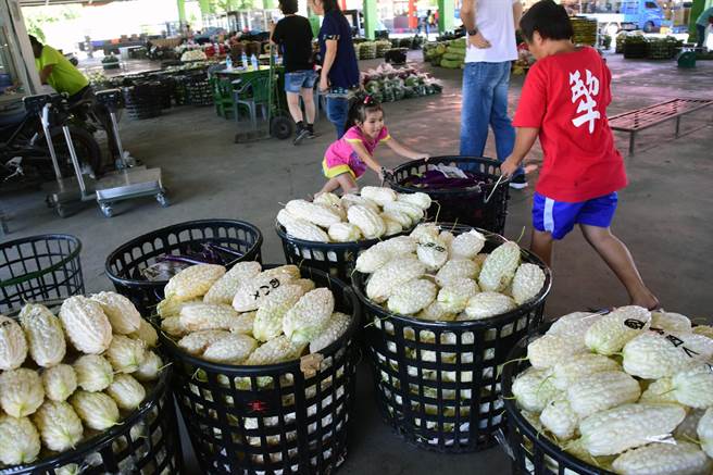 臺(tái)東在地苦瓜、絲瓜滯銷,價(jià)格下跌,在果菜市場(chǎng)幫忙的小朋友,請(qǐng)大家多采購好吃又便宜的苦瓜。(圖片來源:臺(tái)灣《中時(shí)電子報(bào)》)