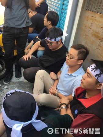 國民黨青年黨工阻擋“執行署”查封黨工宿舍。(圖片來源:臺灣“東森新聞云”)