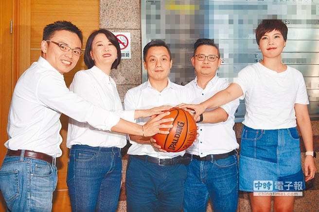 國民黨發言人1日亮相,文傳會義務副主委洪孟楷(左起)、臺北市議員王鴻薇、文傳會主委李明賢、新媒體部主任黃健豪、新任文傳會副主委兼文宣部主任鐘沛君共同拿籃球,高喊“重返執政,國民黨加油”,希望2018地方選舉投“藍”成功。(圖片來源:臺灣《中時電子報》)