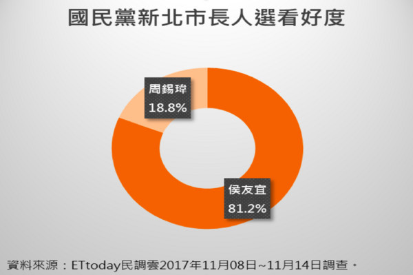 據臺灣“東森新聞云”8月份報道,國民黨主席吳敦義與新北市長朱立倫達成共識,將派出目前民調較穩的侯友宜力守。侯友宜也積極經營臉譜網(Facebook)并對重要時事發表意見,看得出相當有企圖心。有民調指出,就算民進黨派出賴清德參選,在全體網友的意見中,侯以42.2%支持度擊敗賴的38%。