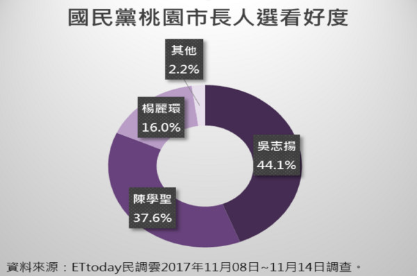 桃園市長方面,吳志揚曾任桃園縣長,2014年代表國民黨參選桃園市長時,敗給民進黨陣營的鄭文燦。據臺灣“中時電子報”報道,桃園市議會9月份進行2018桃園市長問卷調查,了解選前1年民眾對于桃園市長人選的意見,共發出1萬份抽樣。7位可能參與桃園市長人選,暫以吳志揚、陳學圣、魯明哲領先,吳志揚為現任“立委”也是前任縣長。選民認為吳與鄭文燦競選的機率較高。