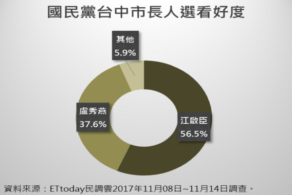 在競爭對手部分,盧秀燕的民調支持度暫時領先江啟臣8%;但在看好度部分,江啟臣則是略高盧秀燕約2%。學經歷部分,有52%民眾認為江啟臣比較符合市民對市長身份的期待,盧秀燕則只有34.51%。在競選對戰支持度部分,江啟臣以46.3%,勝過林佳龍的30.37%,盧秀燕則以46.43%勝過林佳龍的29.71%。