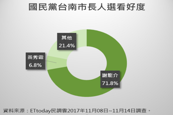 臺南市候選人中,現任市議員謝龍介(71.8%)受網友看好,上屆參選落敗的黃秀霜看好度僅6.8%。交叉分析顯示,謝龍介不論在哪個族群的看好度都大幅領先黃秀霜。