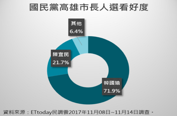 高雄市以現任國民黨高雄市黨部主委韓國瑜(71.9%)民調最高,網友最看好其出面挑戰高雄市長寶座,而現任不分區“立委”陳宜民的看好度為21.7%,且不論在男性或女性均獲7成2左右的看好度,大幅勝過陳宜民。年齡方面,韓國瑜不論在哪個族群的看好度都大幅領先陳宜民。