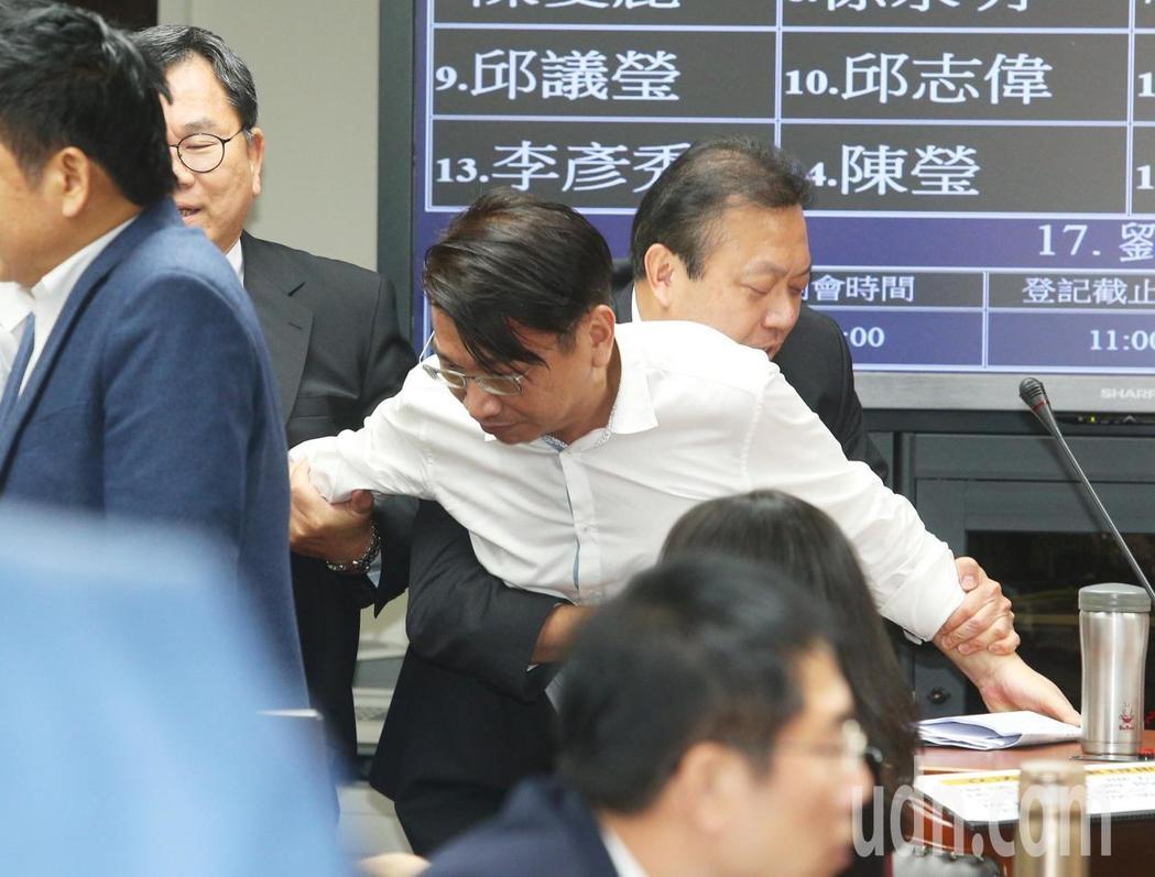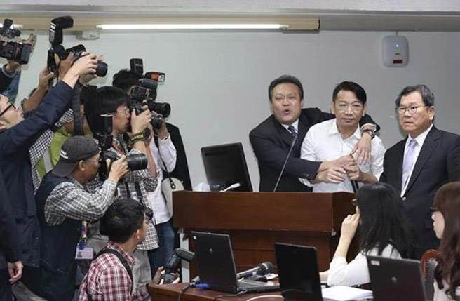 “時代力量立委”徐永明(右二)強占發言臺近11個小時后,在民進黨“立委”強力拉扯出“委員會”后,會議才可開始。(圖片來源:臺灣《聯合報》)