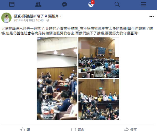 邱議瑩3年前為“太陽花”感性發文。(圖片取自臺媒)