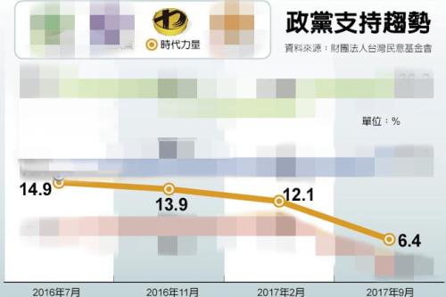 據《聯合報》今年9月份報道,親綠的臺灣民意基金會針對政黨進行支持度的調查,“時力”的支持度僅剩6.4%。基金會董事長游盈隆稱,“時力”流失原有支持度的57%,“這對一個新興的小黨可以說是一個非常嚴重的警訊,有邊緣化和泡沫化危機!