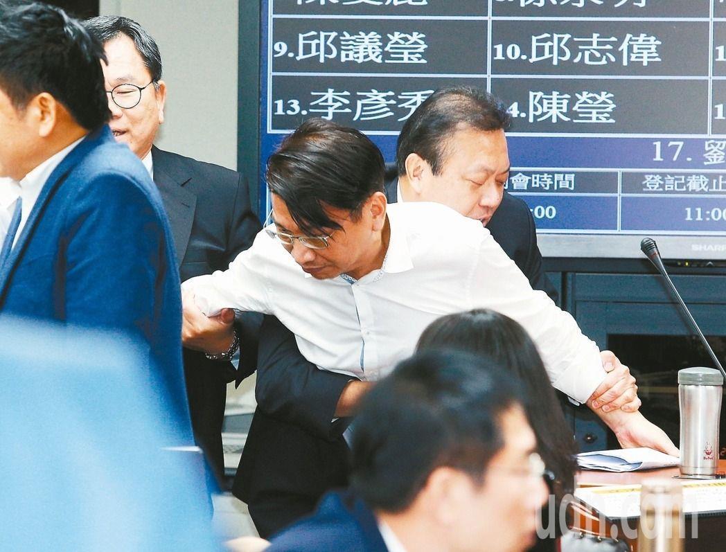 徐永明(中)占據質詢臺要求復議期過后才初審,持續僵持不下,民進黨“立委”蘇震清(左)與陳明文(右)上臺軟性規勸,依舊無法順利開會,晚間蘇、陳兩人合力把徐永明架出議場外。(圖片來源:《中時電子報》)