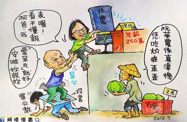 對此,有網(wǎng)友貼出一張插畫狂酸。據(jù)《中時電子報》報道,畫中“吳父”踩著跪在地上的軍公教,將女兒推上年薪250萬的北農(nóng)總經(jīng)理位置,女兒說“阿爸,我看不懂報表喔”,阿爸則回她“安啦!你說你‘愛呆丸’就好…”;而一旁手捧2元高麗菜的農(nóng)民則在飆淚。網(wǎng)友紛紛留言,“老爸干掉軍公教,女兒干倒果菜農(nóng),一門豪杰!”“資歷不可靠,買衣服選綠色的就對了!”