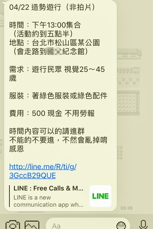 童仲彥留言表示,“這絕對不是網軍!這是阿童的好朋友滲透進line群組截到的圖,領500?是走路工嗎?#遍地義勇軍!苯貓D內容則可以看見,LINE群組共有12名成員,對話內容說:“這天會很多團,要找我們自己的團,不然會領不到費用!薄包c完名,結束后就現領500!钡葘υ。