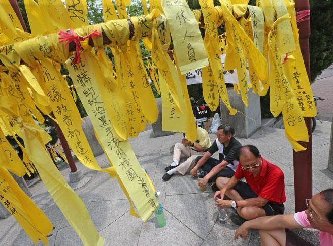 “藍委”沖入臺當局“教育部”綁黃絲帶。(圖片來源:臺灣《中時電子報》)