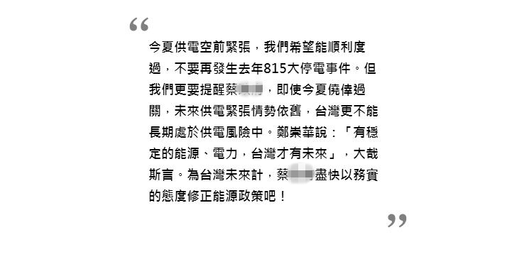 因此說明年之后就無缺電之虞,不只過度樂觀更已枉顧現實。現實狀況是:供電仍然吃緊,蔡當局必然要讓原本應除役的老舊電廠繼續運轉,臺中、高雄地方對電廠減煤兩成的要求也不能執行。但這么一來,全臺的空污與排放就難有改善的一天。蔡英文在接見環保團體時說“這10年是臺灣能源政策轉型最痛苦的10年”,其實更接近事實,也代表供電緊張會是長期問題。