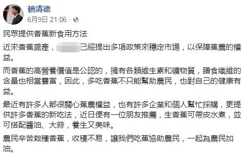 賴清德發出此種號召無非是想幫蕉農多賣香蕉,然而就像網友說的,只能用這種方法幫助蕉農嗎?全民吃香蕉的劇目何時能不再上演?