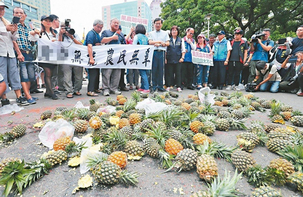 鳳梨價格慘跌,南投、云林、嘉義、高雄、屏東等縣市的農民怒砸鳳梨抗議,果肉散落在“行政院”大門。(圖片來源:臺灣《聯合報》)